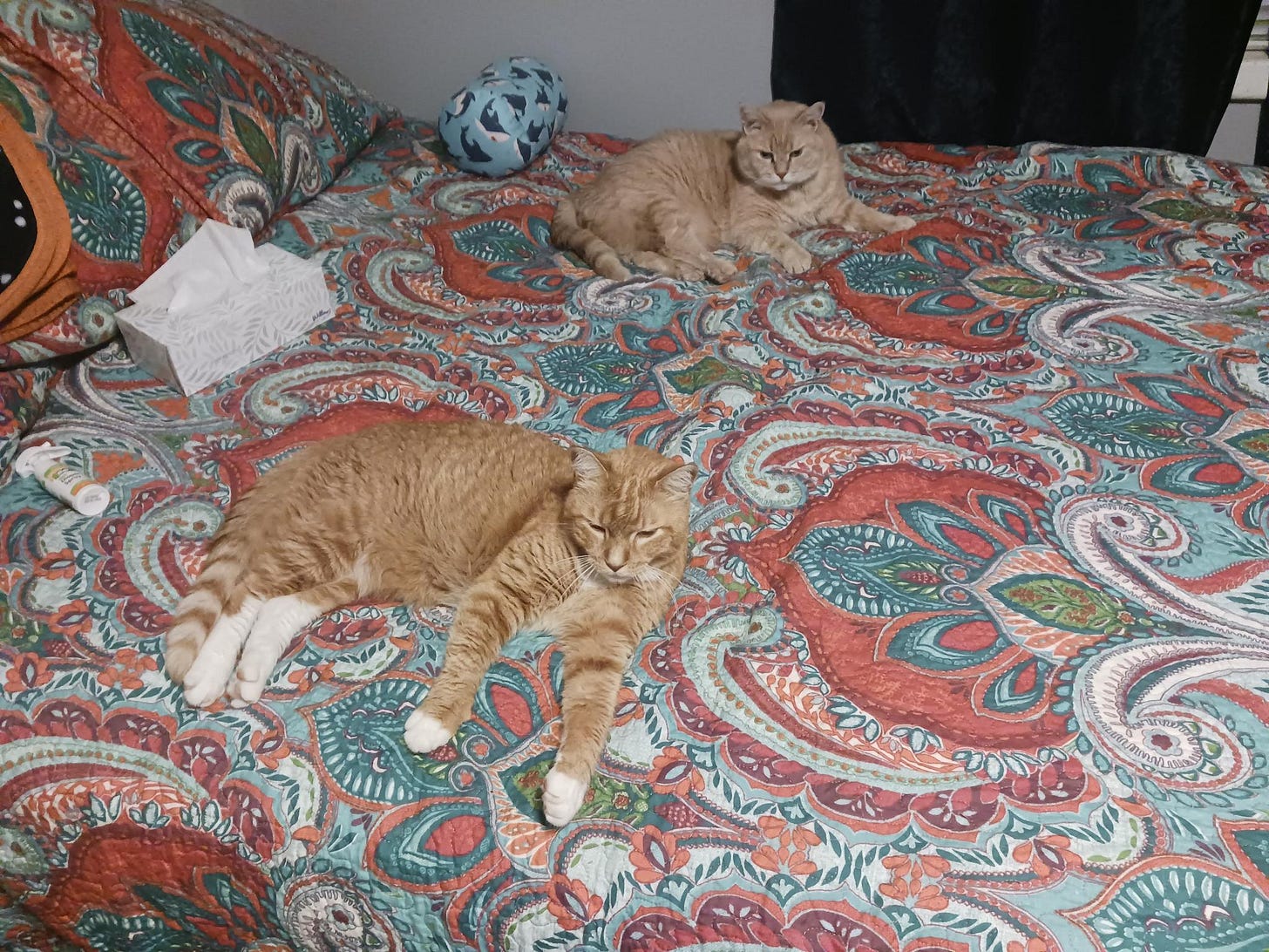 So then, boom. Once I was done with that, I went to make the bed and realized it’s been warm enough that maybe it was time to change out the bedding from winter stuff (fleece sheets and a velvet comforter) to warmer weather stuff (microfiber sheets and a cotton quilt). Now I’m not a neat freak by any means, but I love having the bed made. I feel like if the bed looks pretty, it simultaneously makes the whole room look neater, and also makes you want the rest of the room clean if it’s not. I can’t explain how it does both, but it just does. Also, most people don’t know this (and I can’t remember where I first heard it, or I’d include a source), but it’s healthier to let your bed air out for like 20-30 minutes before making it, just in case you got leftover sleep sweat going on. Trapping that moisture in the sheets is an open invitation for dust mites and the allergies they like to bring with them. So reasonably, sometimes for me, getting the bed made doesn’t happen since I do wait on it and it might just get sidelined completely. But when I do, it always makes me feel more accomplished and that bleeds into everything else, much like changing the batteries did. Anyway, know who else likes a beautifully made bed? Cats. Other than an open, empty box, it’s probably the best way to attract a loafing cat. I have two kitties, one of them who practically lives in the bedroom, and the other who is outside most of the time (unless he’s in the living room recliner). But with the bed all pretty and made, they both just had to be there, even though they barely tolerate each other.